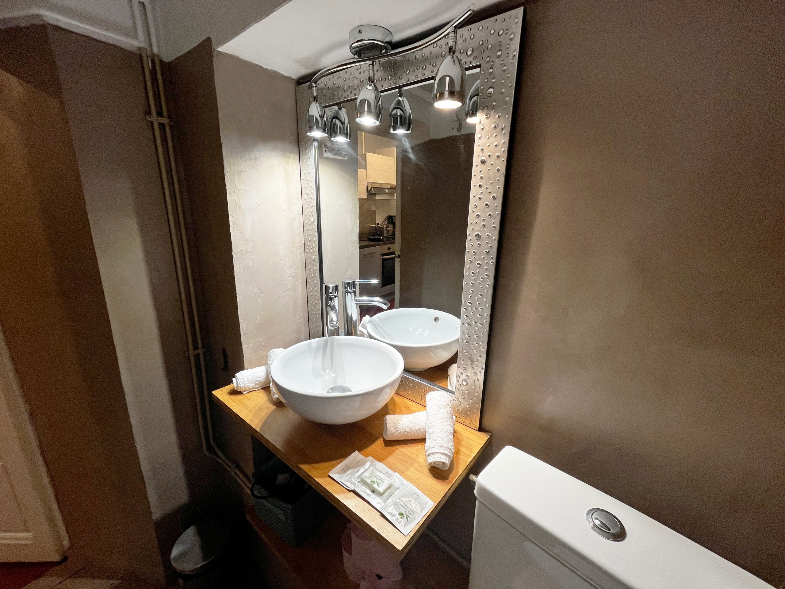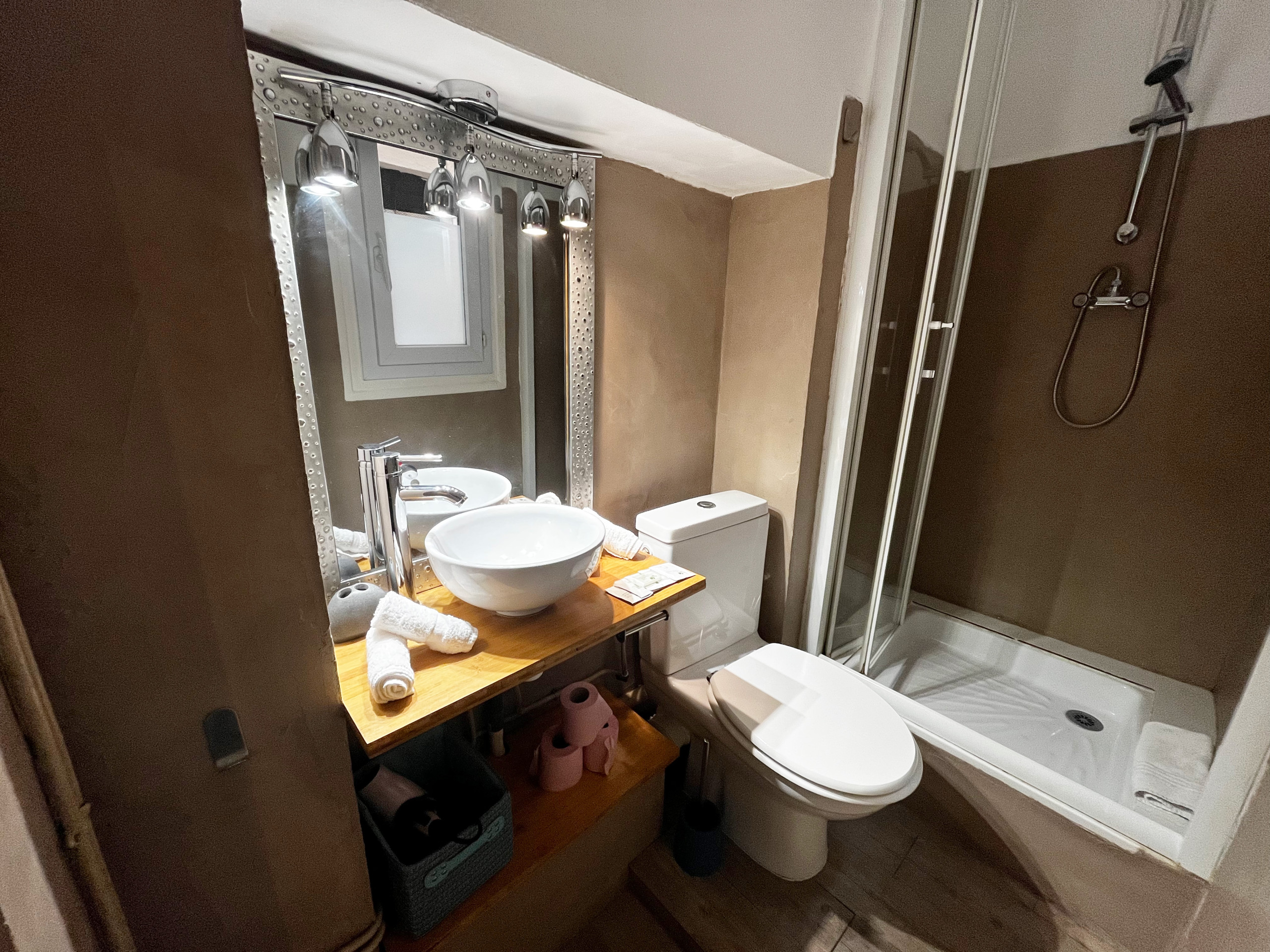 La salle d’eau, moderne et fonctionnelle, dispose d’une douche, d’un lavabo avec meuble de rangement, d’un grand miroir, ainsi que d’un sèche-cheveux.