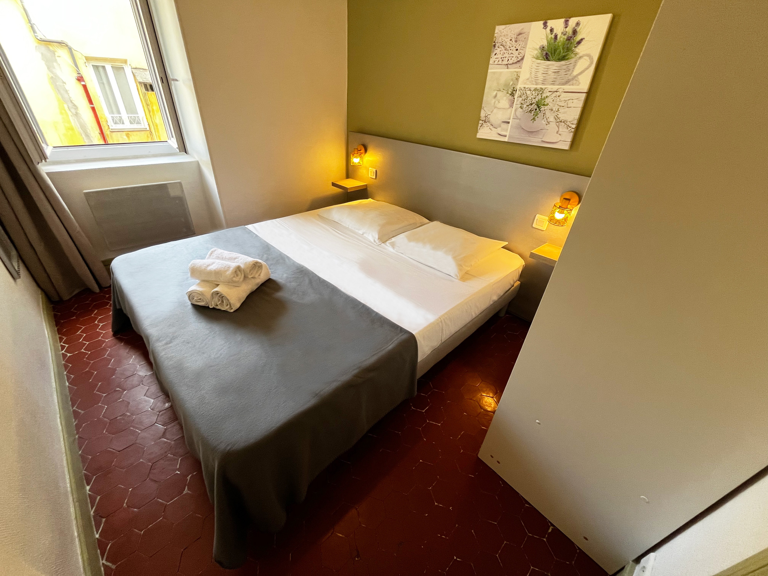 La chambre à coucher est chaleureuse et confortable, avec un lit double ainsi que tout le nécessaire pour vous détendre. Un lieu de repos idéal, au calme, pour recharger vos batteries après une journée sous le soleil niçois.