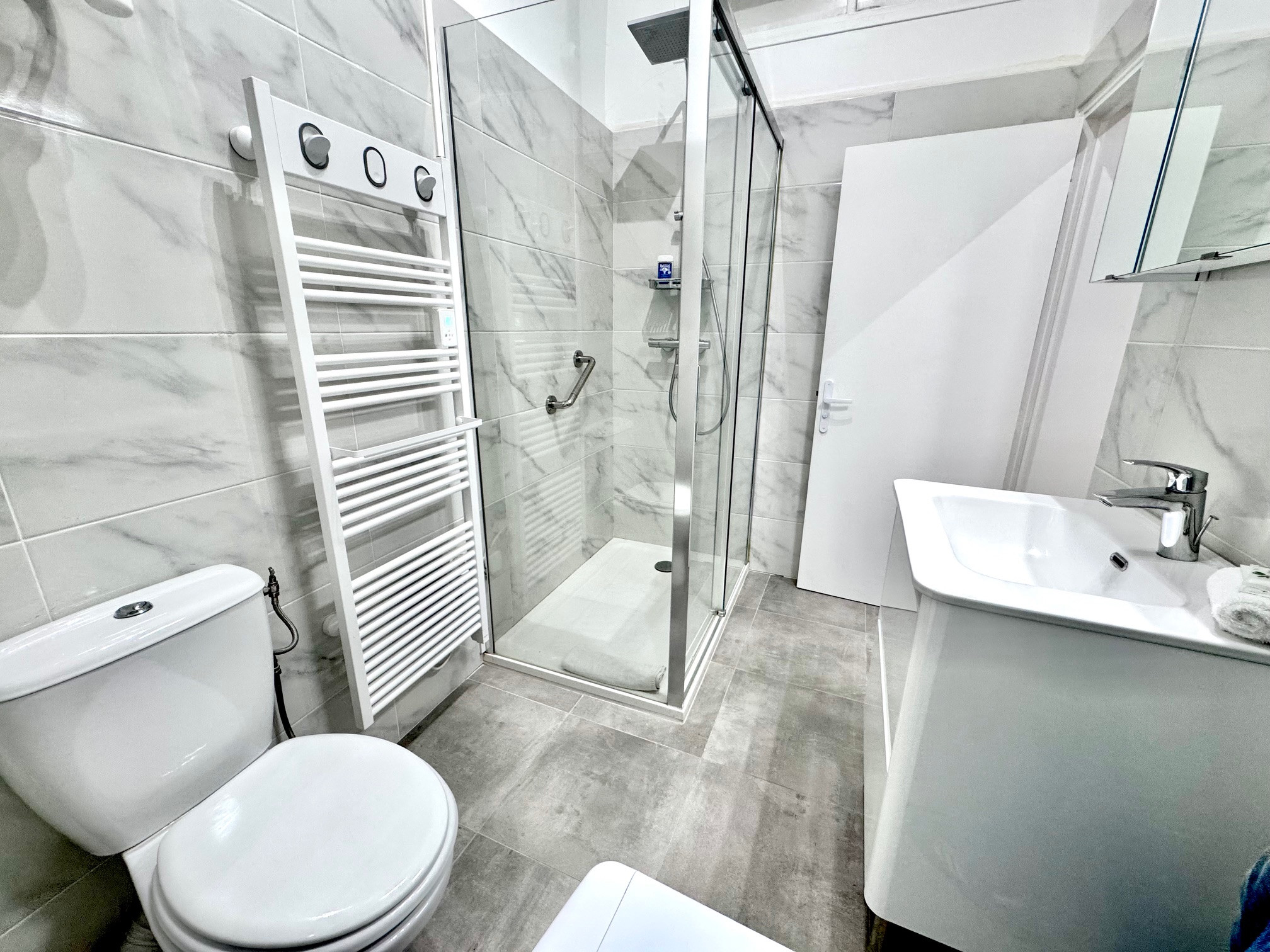 La salle de bains est neuve et entièrement carrelée. Elle dispose d’une douche à l'italienne, d’un lavabo avec meuble et un grand miroir.