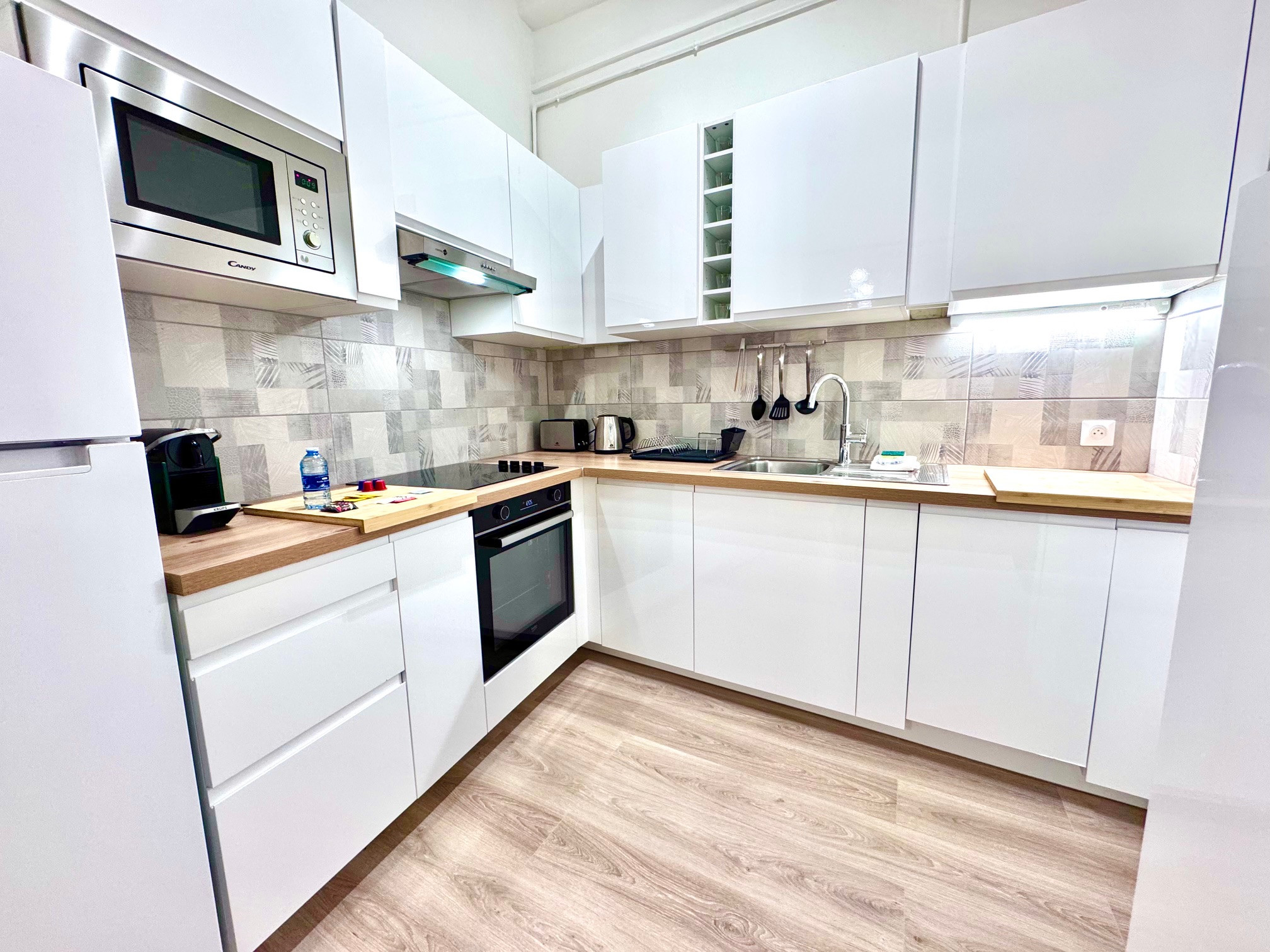La cuisine moderne et parfaitement équipée. Elle dispose de quatre-plaques de cuisson, four, réfrigérateur avec compartiment congélateur, lave-linge et lave-vaisselle. Il y a aussi une large gamme d'ustensiles de cuisine. Mais une multitude de restaurants tous proches de chez vous vous accueillerons pour y déguster en large gamme de cuisine du monde.