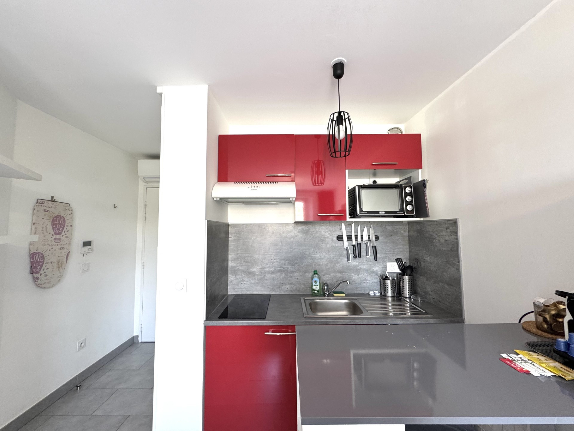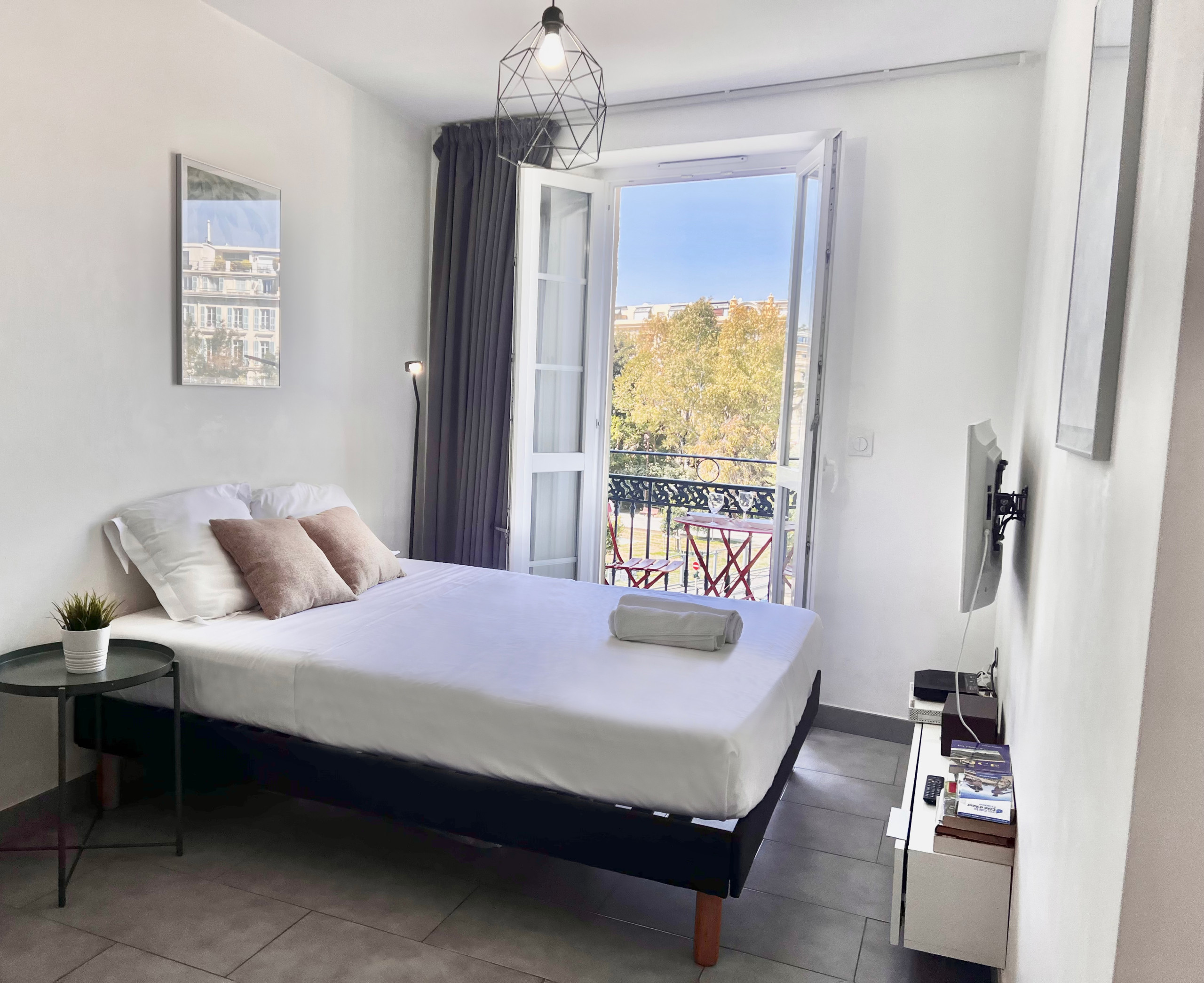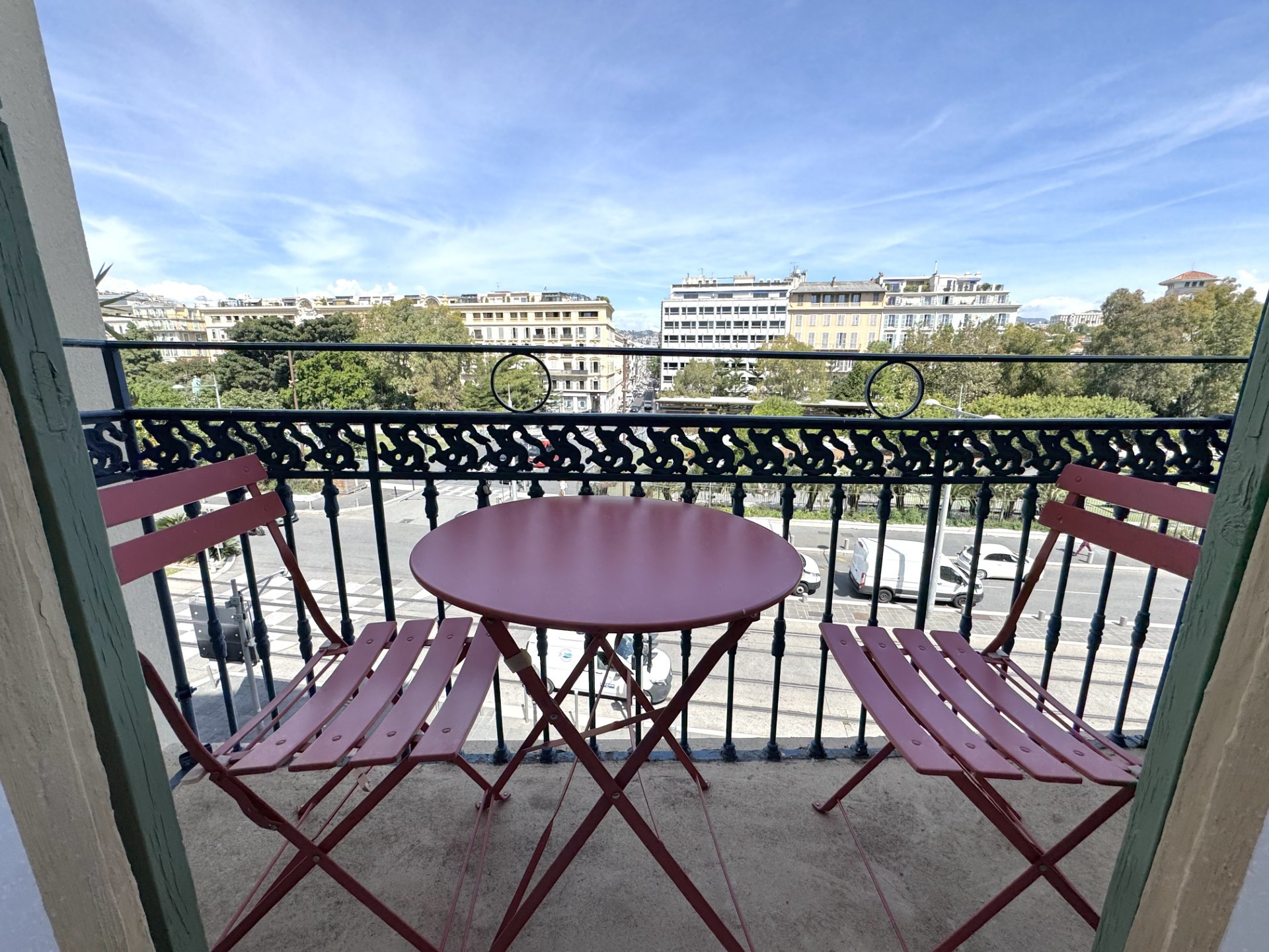 Ce logement de 20 m², lumineux et décoré avec soin, dispose d’un petit balcon tout mignon avec vue dégagée sur les jardins de la Promenade du Paillon, parfait pour un café matinal ou un verre en fin de journée.
