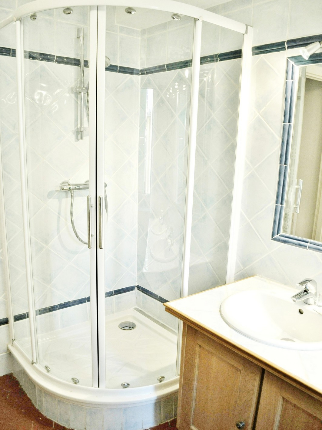 The bathroom, entirely decorated in mosaic, is functional and comfortable. It is equipped with a shower, a washbasin and a washing machine.