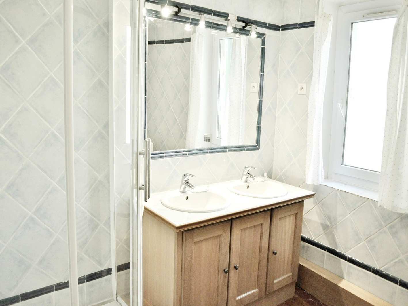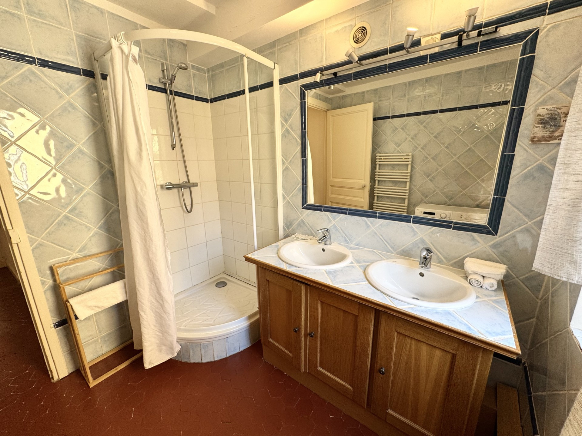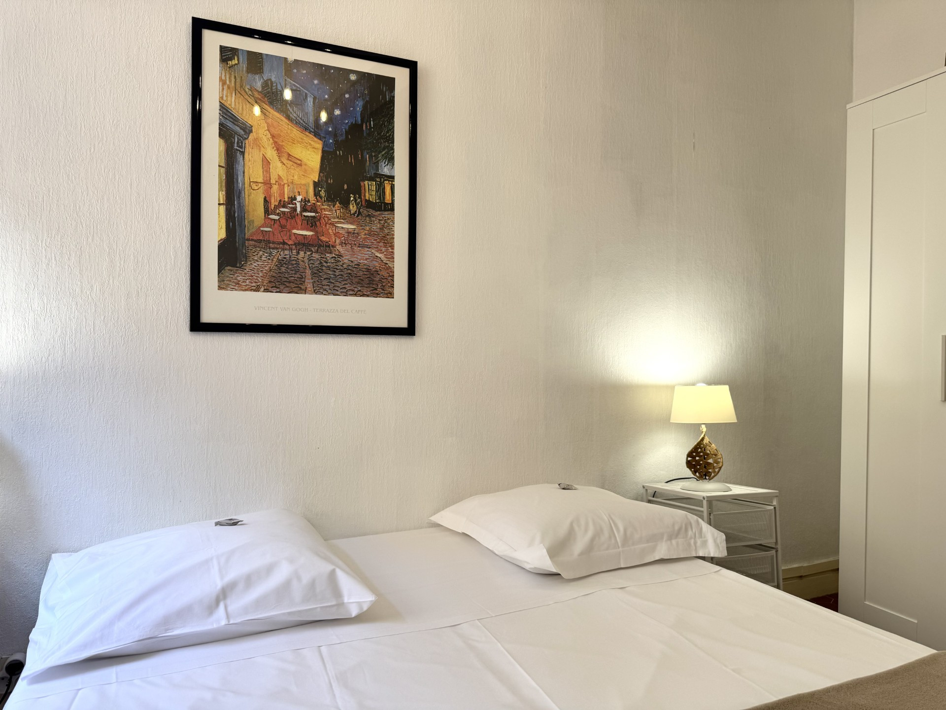 The vast living room, with its typically Nice charm with its terracotta tiles and moldings, exudes a warm and classic atmosphere. Furnished with a comfortable sofa, two armchairs and a coffee table, it invites relaxation. A complete video equipment (television, player, Wi-Fi connection) is at your disposal for your moments of rest. The room is through-flowing, bright and pleasant to live in.