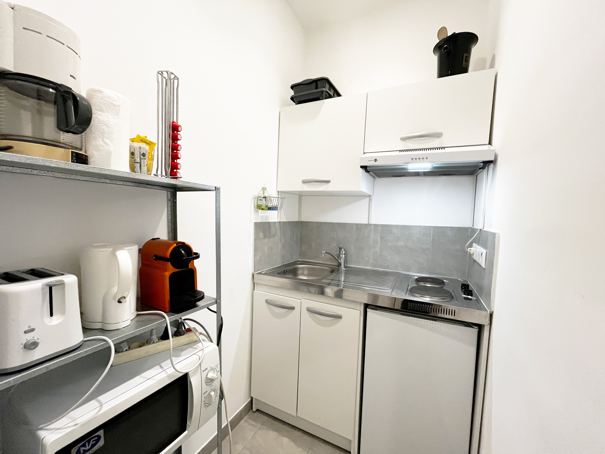 Independent and well-equipped, the kitchen has everything you need for your meals at home: refrigerator, microwave, coffee maker, kettle, toaster, crockery and utensils.